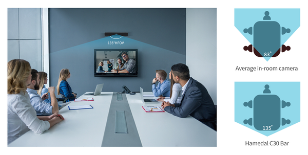 Hamedal C30拥有定制化设计的135°水平超广角镜头,相比于市面上传统的83度摄像头,广角更大,且无畸变。能将所有与会人员都囊括屏中,轻松覆盖会议室的每个角落。采用1200万像素镜头,支持4K超清视频通话,让细节呈现更加真实,会议体验身临其境。