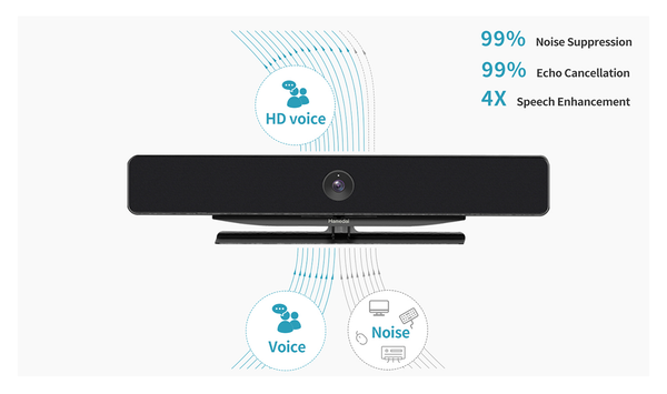 HamedalC30 通过上千小时不同会议数据学习的AI模型,能够有效抑制各种会议室噪音,如鼠标、键盘敲击声、电脑及空调运转声等。其强大的算法能力可在最大程度消减室内噪音的同时,保留自然的语音原声,确保与会人员的注意力高度集中。