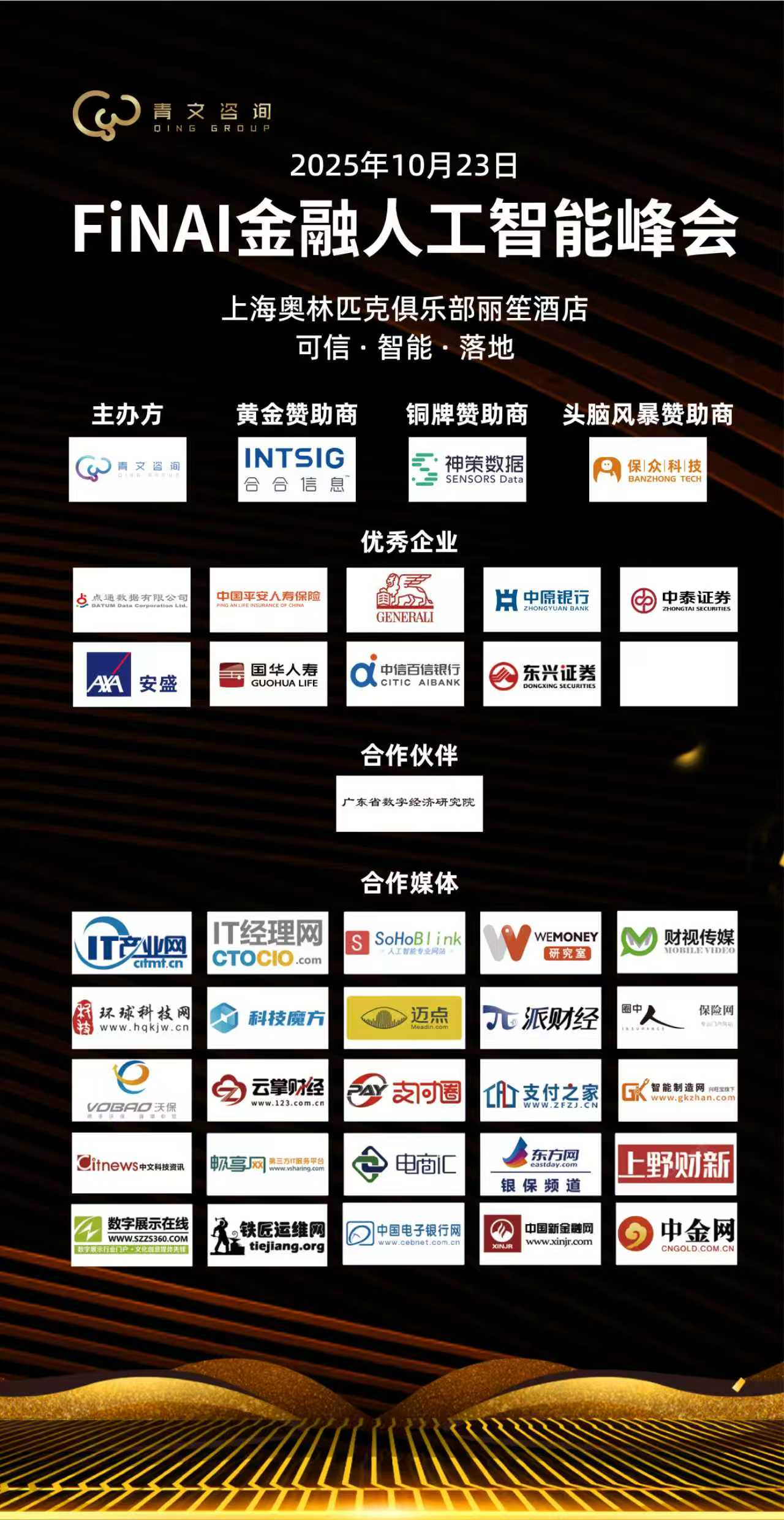 2025年10月23日,由青文咨询主办的2025 FiNAI金融人工智能峰会于上海奥林匹克俱乐部丽笙酒店成功举办。峰会以 “可信 · 智能 · 落地” 为核心主题,汇聚了来自国内外顶尖金融机构、资管公司、保险科技、量化投资及AI原生企业的286位行业领袖与技术专家,共同探索人工智能在金融领域从技术能力到业务价值的全面转化,彰显了峰会在推动行业务实发展方面的前沿影响力。